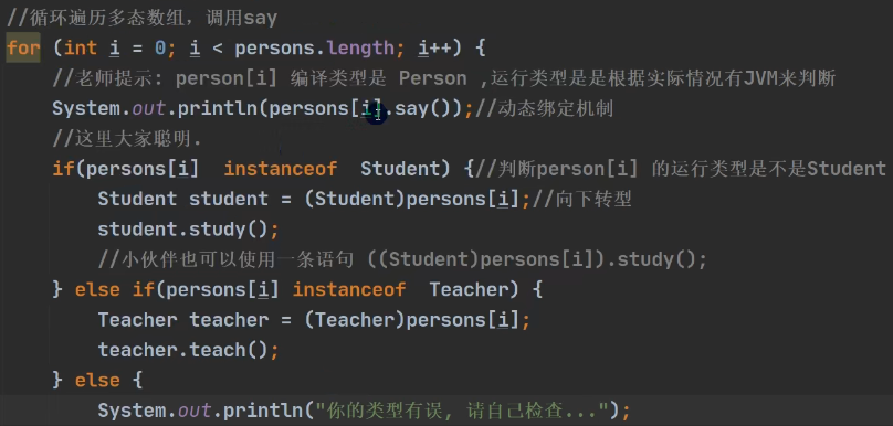 //如何调用子类特有的方法, 比如Teacher有一个teach, Student有一个study , 怎么调用