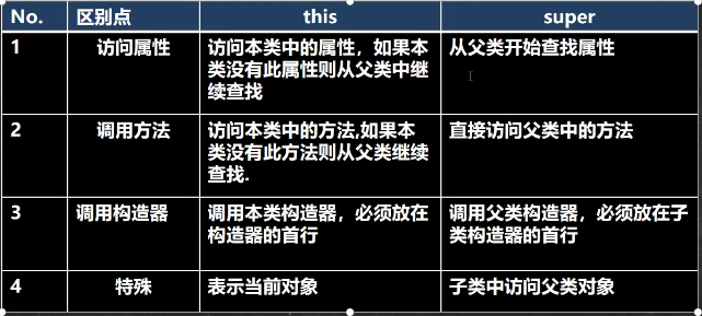 当子类中有和父类中的成员(属性和方法)重名时, 为了访问父类的成员, 必须通过super. 如果没有重名, 使用super, this, 直接访问是一样的效果