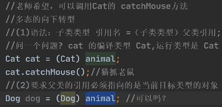 语法: 子类类型 引用名 = (子类类型) 父类引用